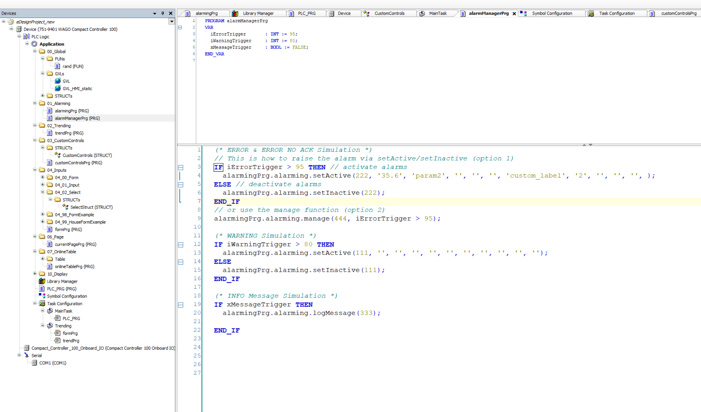 The Codesys integration handles the activation and deactivation of alarms within the PLC logic. It interfaces directly with the alarm front-end via variable binding.
